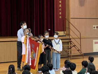 子ども会連合ソフトボールのメンバー四人に、立派な優勝旗が授与されました。