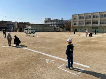 歩道がないところでの歩き方や、信号を渡るときの注意など、普段意識せずしていることを振り返りクイズ形式で出していただきました。運動場に作った道路で実際に歩いてみて、注意するところを確認しました。