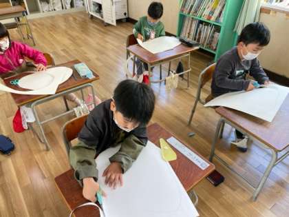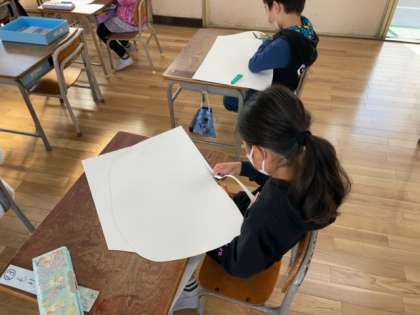 『サラダでげんき』に登場する「大きなお皿」とはどれぐらい大きいのか考えた後、画用紙を切って作りました。