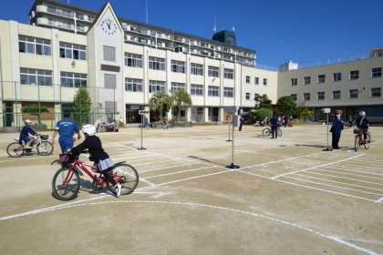 前半は、クイズをしながら自転車のルールを確認しました。後半は実際に自転車に乗りながら安全確認をして、道路の標識に合わせた走行をしていきます。