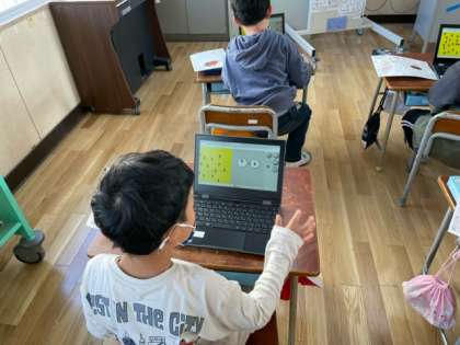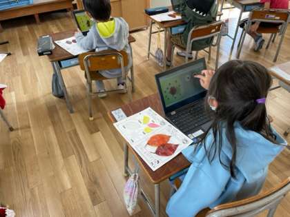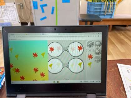 秋見つけをして持ち帰った葉っぱの絵をタブレットで描き、ビスケットという児童用のプログラミングソフトで動かしてみました。