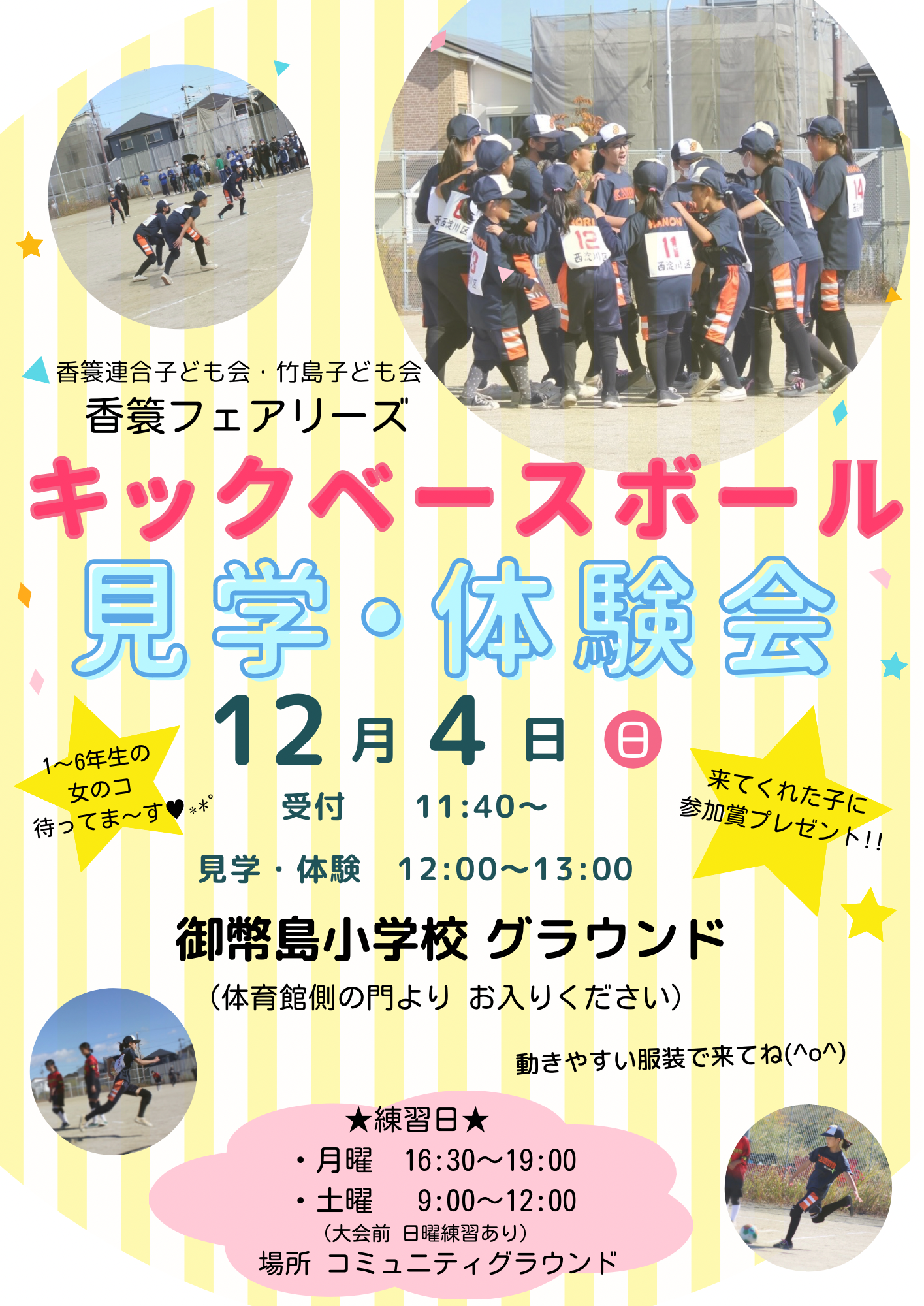 キックベースボール見学・体験会 公開日 2022/11/24 更新日 2022/11/24 学校 香簑フェアリーズのキックベースボール見学・体験会(香簑連合子ども会・竹島子ども会協賛)を12月4日(日)に御幣島小学区グラウンドにて行います。 詳しくはこちらをクリックしてください。 ↓ ↓ いいね(0)