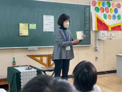お話サークルパタポンの方が来校し、2つのお話を聞きました。挿絵がない中、頭の中でお話を想像しました。