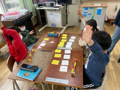 算数科では、足し算・引き算のさらなる習熟のために、数字あてゲームを行いました。