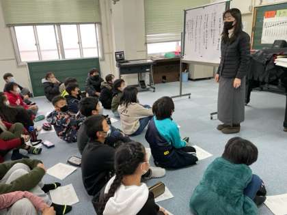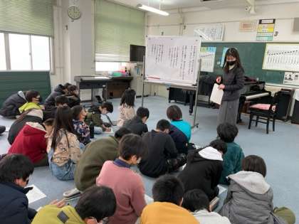 甲斐先生に来ていただき、卒業式で歌う「風の言葉」という合唱曲について学習しました。どうしてこの曲を卒業式で歌うのか、どんな歌詞なのかなどのお話をしていただきました。
