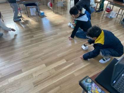 タブレットを使い、自分でプログラムした通りに動くロボットを見て子どもたちは大はしゃぎ。