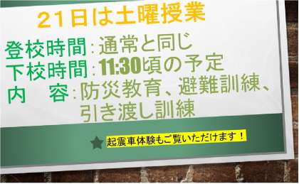また、21日土曜授業を含め、23日の代休に関しましてもご理解いただき重ねてお礼申しあげます。