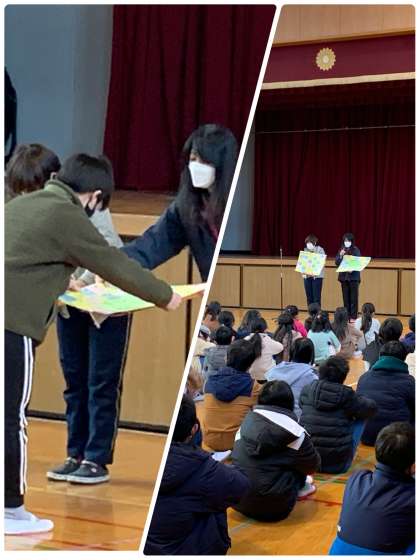 いつも美味しく作っていただく給食調理員さんへ、児童全員から感謝の気持ちを込めて、代表児童からメッセージカードが手渡されました!