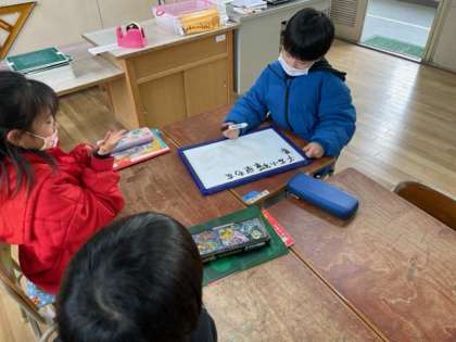 グループ活動で漢字の学習を行いました。ホワイトボードを初めて使いました。一人一つ漢字を書いたら次の人に回します。制限時間内(5分)で一年生で習った漢字をできるだけたくさん書きます。一番多く書けたチームが優勝です。