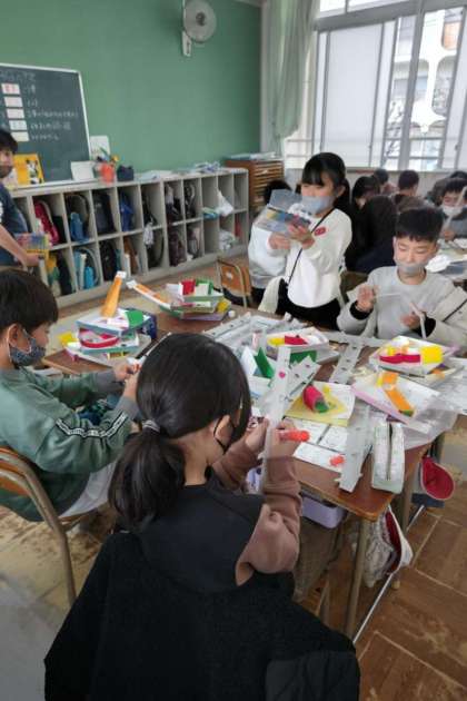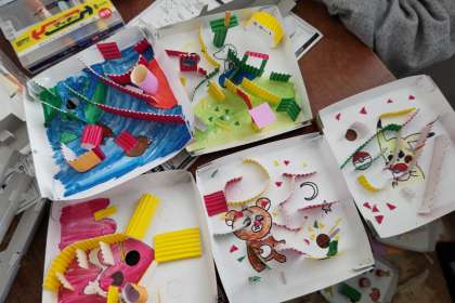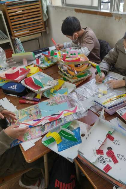 上から下の段にビー玉を落とし、4段目のゴールまでコロコロとビー玉を転がす立体作品を作っています。