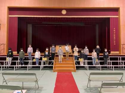 新しい一年生の入学式で発表する「お祝いの言葉」の練習を講堂で行いました。