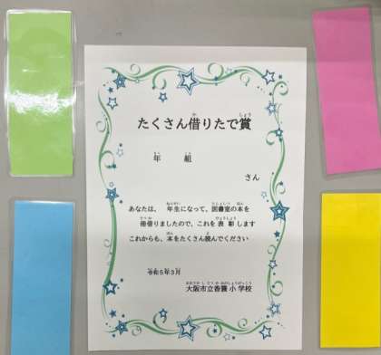 1年間それぞれの学年で1番本を借りた人に賞状としおりが授与されました。