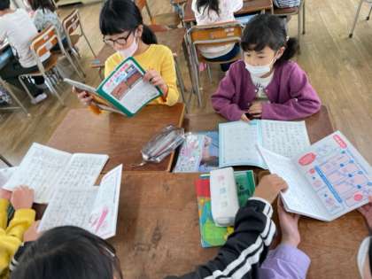 漢字ノートを見ながらお互いのいいところを見つけています。