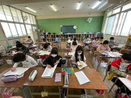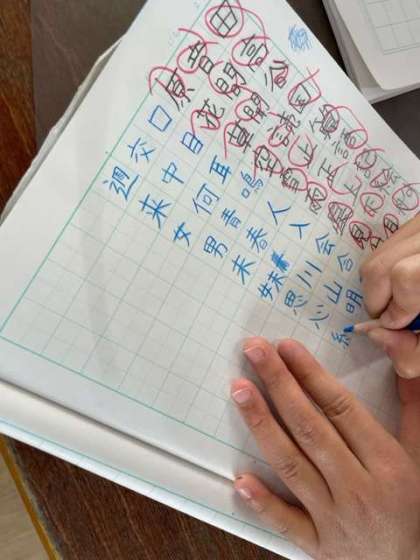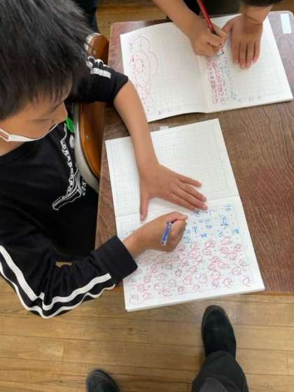 最後に、教科書の後ろに記載されている『2年生までにならった漢字』の表を見て、それまでに書けていなかった漢字を、自分の好きな色鉛筆で書きました。