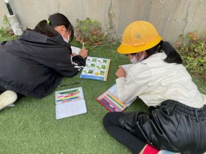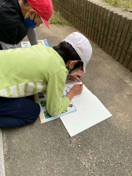 学校の生き物や植物の「大きさ」「形」「色」「特徴」をよく見て観察しました。