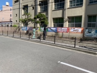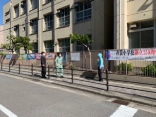 教頭先生や管理作業員さんなど多くの方々にご協力いただき、学級目標を正門付近に取り付けました。