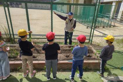 先の芽が大きくなってきて、できるよ〜と教えていただき、日が良く当たる東側に芽を向けて苗をおき、やさしく土をかけていきます。