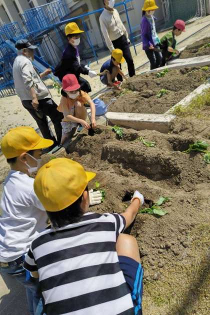 初めて苗を見て、子どもたちは「根がない」とびっくり!