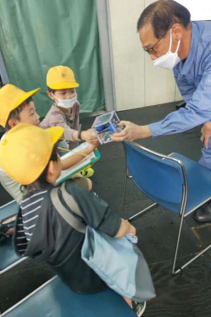 植田鉄工所では、何を作っている工場かを丁寧に説明してもらい、ヘルメットをかぶって実物も見せていただき、子ども達は大興奮でした。