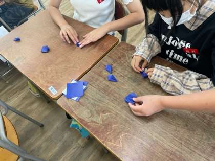 途中まで折れる子は途中まで折り、5年生が続きを折るのを手伝っていました。