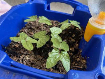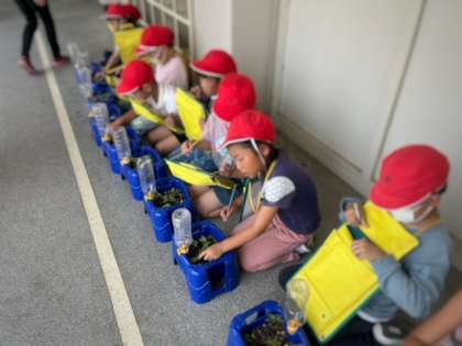 先日植えたあさがおの芽が出てきたので観察をしました。「うさぎの形みたい!」「ハートの形!」「くきの色が違う!」などといろいろな発見がありました。