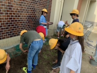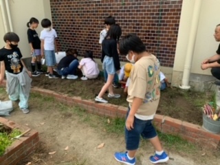 ヘチマとひょうたんを植える前に学習園の雑草をとりました。