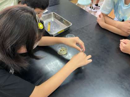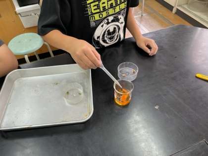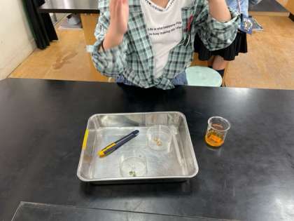 今日はインゲンマメの種子と、しぼんだ子葉にでんぷんがふくまれているかを調べる実験を行いました!