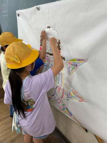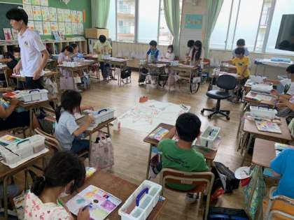絵の具で一人二本ずつ曲線を描き、だんだん円を大きくしていき、全員で描きました。