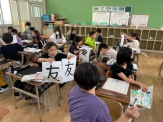 書いた字を友達同士で見せ合い、アドバイスをします。