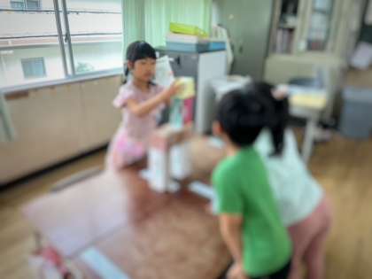箱やあきかんを使って、班の友だちと動物や乗り物を作り、工夫したところを発表しました。