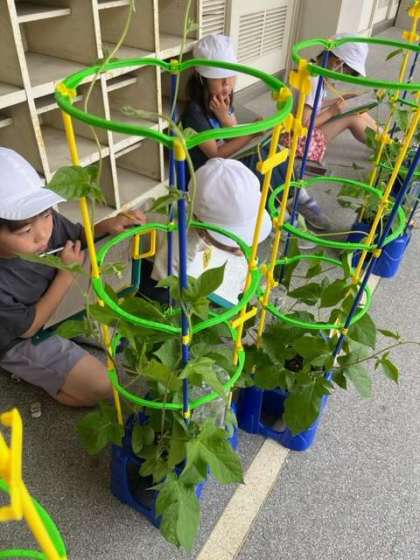 あさがおのつるが伸び、支柱に巻きついてきました。お隣の友だちの支柱に巻き付いてるのもみられ、みんな「なかよしだね〜」と微笑ましくみていました。