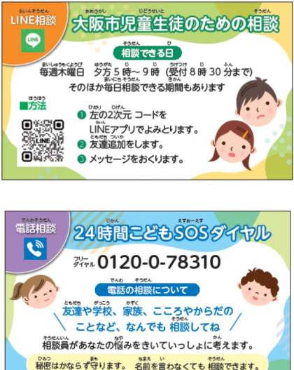 つきましては、児童へ本カードを配付する(後日)とともに、悩みを抱える件数は、長期休業明けの時期に増加する傾向があることも踏まえ、児童からの悩みや相談を広く受け止めることができるよう本相談窓口の周知にご活用いただきますようお願いいたします。