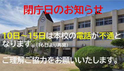さて、7月10日に本校閉庁日についてのプリントを配付しているところですが、10日〜15日までの6日間は本校の電話が不通となるためご連絡いたします。