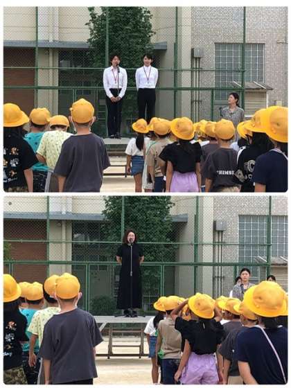 まず、教育実習生のお二人から自己紹介があり「一か月間よろしくお願いします」との挨拶がありました。休み時間には、いっぱい一緒に遊びましょう。