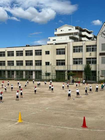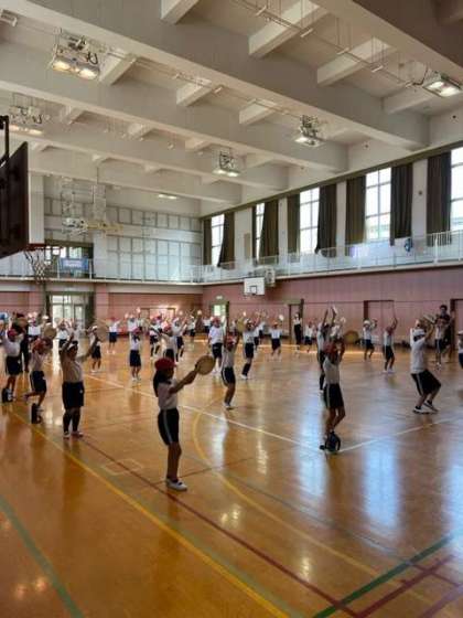 体育館では、中学年が何やら小さな太鼓を持って踊ってます。