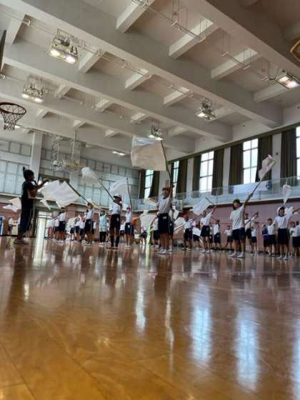 体育館では、高学年が旗を振りながら歌ってますねー。