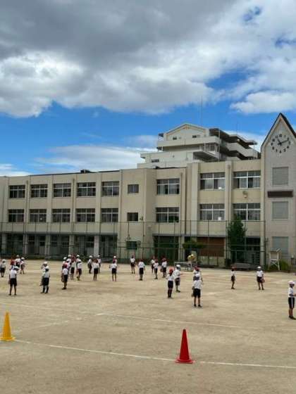 グランドでは、中学年が位置の確認や入場の確認をしています。