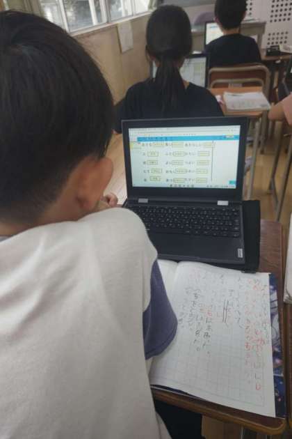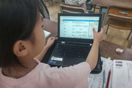 黒板や紙面上で学んだ反対言葉を、パソコンを使って復習したり、丸付けをしたりと頑張りました。