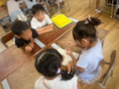 乾燥したオクラをひろげてオクラの種を収穫しました。皆んなで順番に回しながら、「わーー!!固い!!」「黒い種が出てきたー!」と目を輝かせて見ていました。