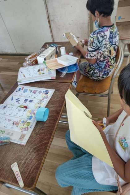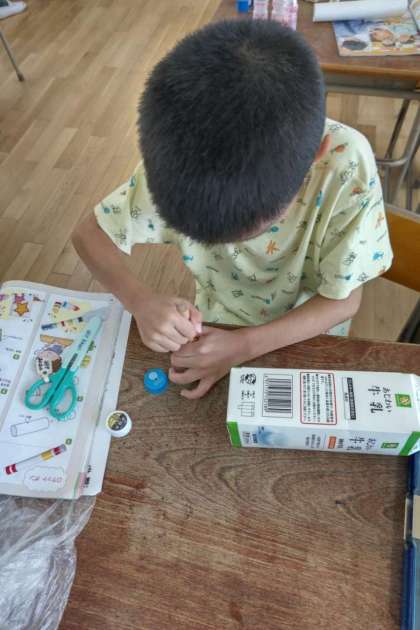 失敗してもいいから『自分でやってみよう』と必要な材料を考え、かるこ、はさみ、ホッチキス等を使い試行錯誤しながら自身で作っています。