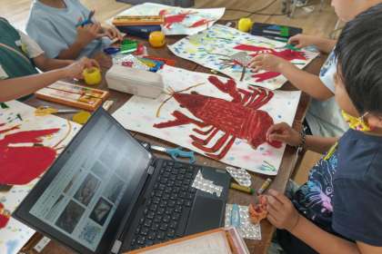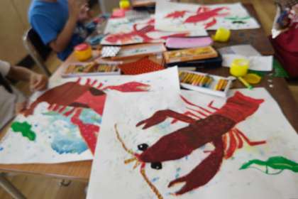 1学期から大切に育て、絵に表しているザリガニですが、改めてザリガニのすみかについて調べました。