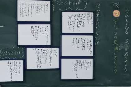 小学校生活を1年半終えた子どもたち、1年生のときに学習した「ふわふわ言葉」や「うきうき言葉」だけでなく、具体的なうれしくなる言葉をたくさん見つけることができました。
