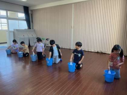 ぞうきんを水につけた後の絞り方を教えてもらいました。