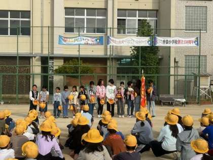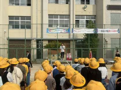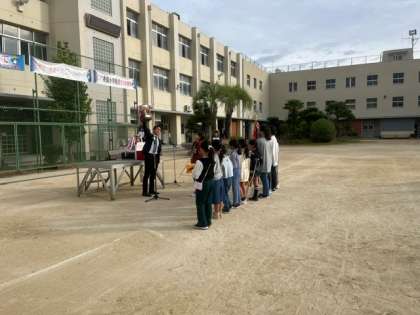 キックベースボール大会で優勝したメンバーに賞状等の伝達とインタビューをしてみました。宿敵との試合前の雰囲気や、緊張感のある試合中について感想を聞き、児童のみんなからは、多くの拍手をもらいました。本当におめでとう!
