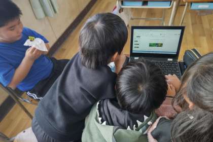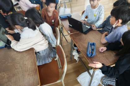 収穫パーティーの準備中です。今日は、クイズ係を中心にパソコンのスライドを完成させました。