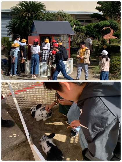 学校で飼っているウサギの「ショコラとバニラ」、亀の「みどりちゃん」との触れ合いを楽しんでいます!