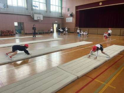 今日は色々な動物になりました。クマ、あざらし、うさぎ、かえるです。手を前に置くこと、手のひらをパーにすることを意識して頑張っています。