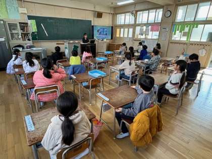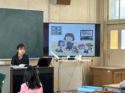 1年生は防災絵本を担任の先生に読んでもらい学習しています。