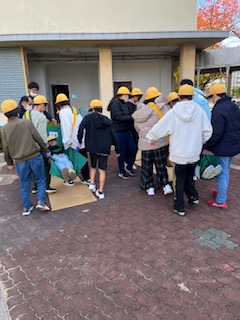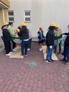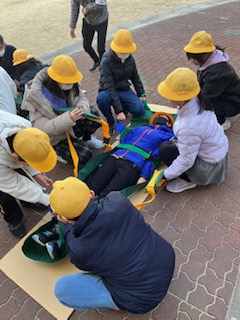 6年生は避難所でのボランティアを想定し、簡易担架での運び方について、あおぞら財団の方から学んでいます。