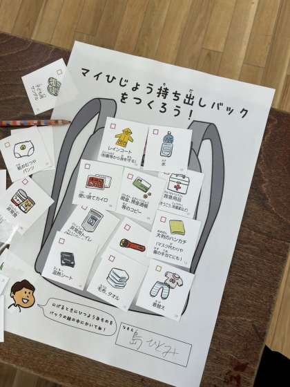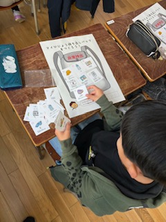 2年生は非常用バッグや目で見る防災について、担任の先生から学んでいます。